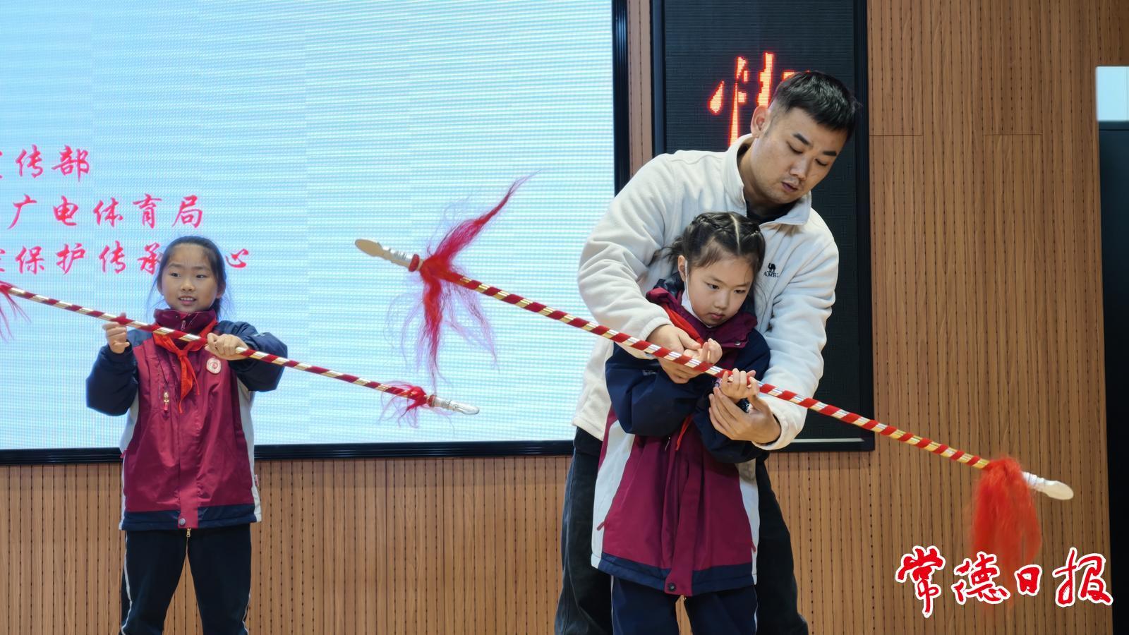 最讓孩子們興奮的,當屬上臺體驗耍花槍的環節。聽到“想試試的同學舉手”的邀請,臺下瞬間舉起一片小胳膊,有的孩子甚至踮著腳、揮舞著手,生怕老師看不到自己,最終被選中的幾名學生,臉上寫滿激動。在演員的耐心指導下,他們小心翼翼地握住長槍桿,指尖輕輕蹭過光滑的木質槍身,眼神里滿是好奇與鄭重。“先把槍端平,手臂別晃,像這樣慢慢轉個圈。”演員手把手調整著孩子的姿勢,幫他們穩住微微顫抖的胳膊。當終于完成一個簡單的“槍花”動作時,臺下立刻響起歡呼聲。