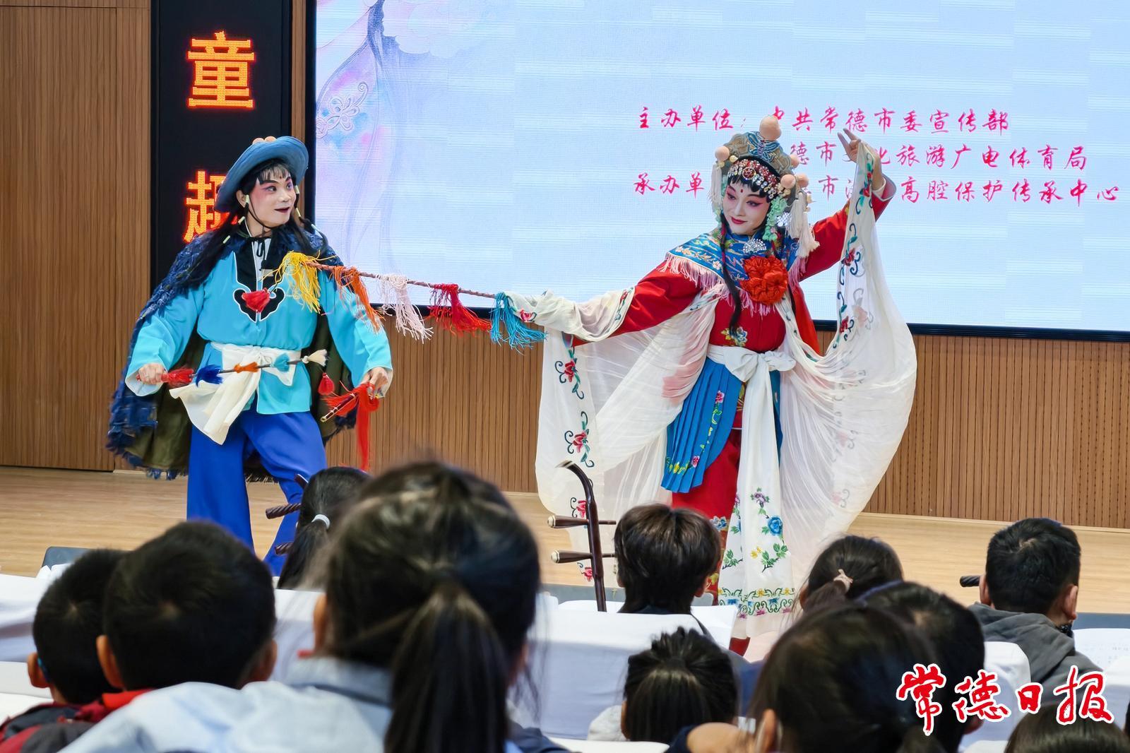 常德日報記者 裴維維 通訊員 葉丹 李莉 文/圖 12月5日,一場別開生面的非遺盛宴在武陵區旭輝東升小學拉開帷幕。常德市漢劇高腔保護傳承中心的演員們走進校園,為200余名小學生帶來了沉浸式的漢劇文化體驗,讓孩子們近距離觸摸非遺瑰寶,感受傳統戲曲的獨特魅力。