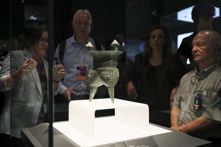 2025年10月13日,第二屆世界中國學大會“中國式現代化”主題參訪活動嘉賓在上海博物館東館青銅館參觀。新華社記者 王翔 攝