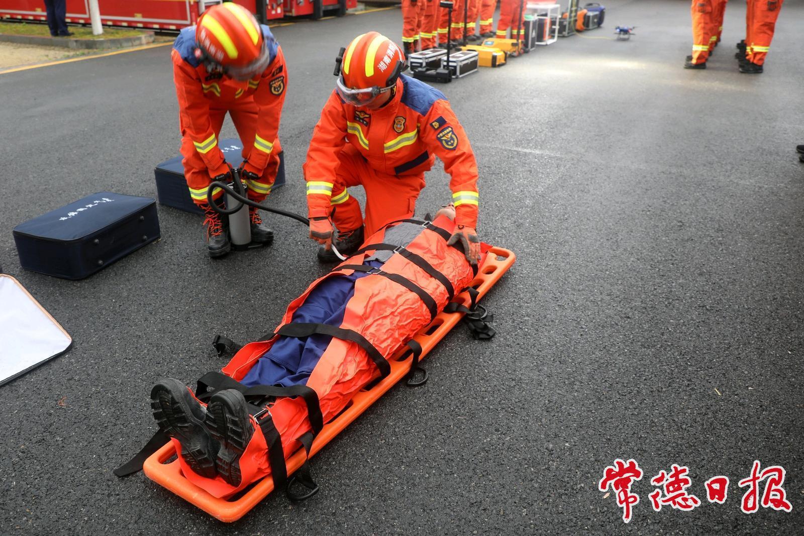 在模擬市民因冰雪滑倒“受傷”的救援場景中,消防員迅速攜帶專業救援裝備趕赴現場,運用軀體固定氣囊對傷員實施穩妥固定與轉運,全程操作精準有序,有效防止二次傷害,展現出扎實的專業素養。