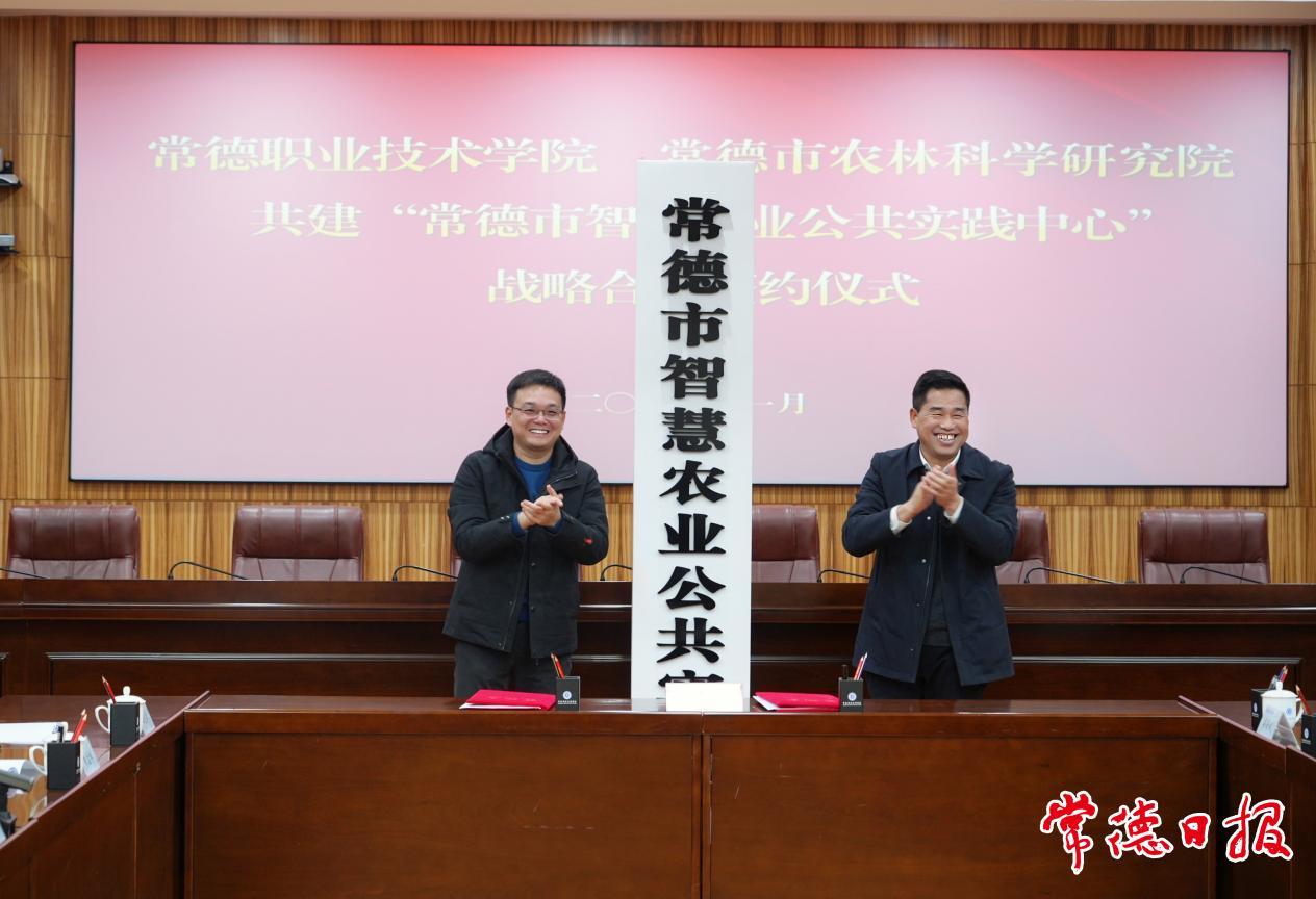在全體與會人員的見證下,常德職業(yè)技術(shù)學院院長周華與市農(nóng)林科學研究院院長彭煒代表雙方簽署戰(zhàn)略合作協(xié)議,周華向市農(nóng)科院授予“常德職業(yè)技術(shù)學院智慧農(nóng)業(yè)教學實踐基地”牌匾。