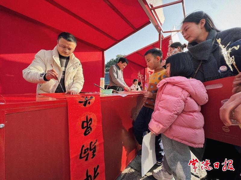 作為當日的重頭戲,由常德市金祥龍貿易有限公司在春秋廣場組織的“墨香迎春”常德書法名家現場贈福活動備受市民歡迎。書法名家齊聚現場,揮毫潑墨書寫春聯與福字,筆鋒流轉間,一副副承載著“馬到成功”“闔家安康”美好寓意的春聯躍然紙上,為新春勾勒出濃墨重彩的文化底色,市民手持剛寫好的春聯,臉上洋溢著幸福的笑容。