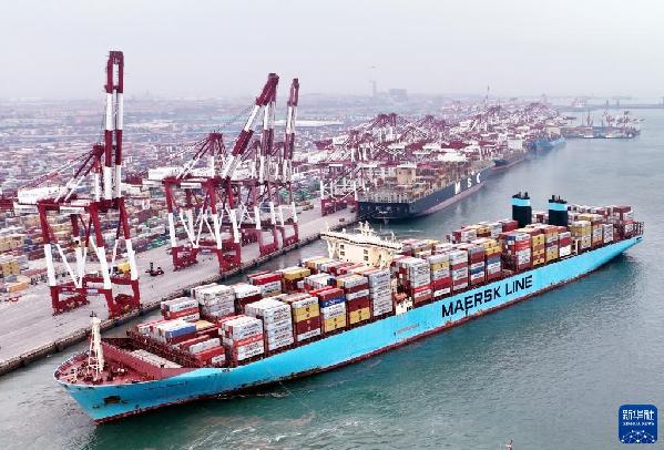 ????在山東港口青島港前灣碼頭,歐洲貿(mào)易航線的“美途馬士基”集裝箱貨輪解纜起航(2022年7月29日攝,無(wú)人機(jī)照片)。新華社記者 李紫恒 攝