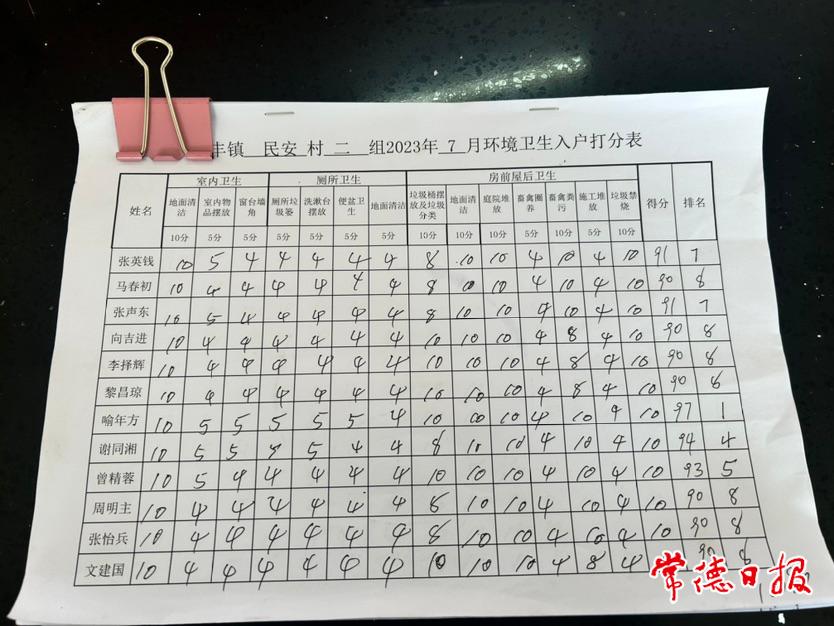 “大到房前屋后的衛(wèi)生,小到廁所的洗漱臺擺放,都是我們每個月入戶打分的重點。”7月18日,在西洞庭管理區(qū)祝豐鎮(zhèn)民安村村部,村黨總支書記葉真翻著該村《7月環(huán)境衛(wèi)生入戶打分表》向記者介紹。